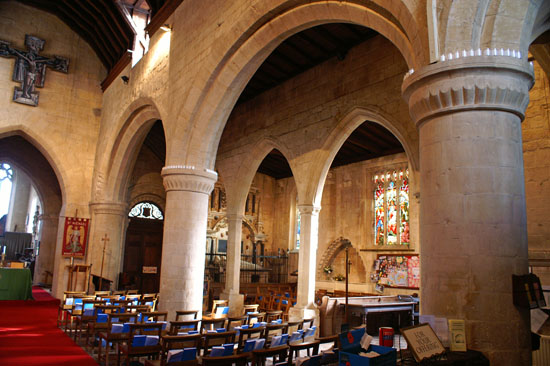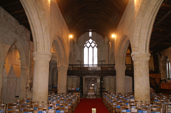 Left: Both transepts have Transitional doorways either side of the chancel arch. This is the northern one. Right: View towards the west end.