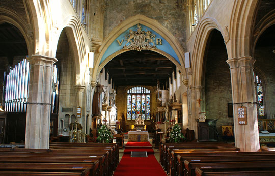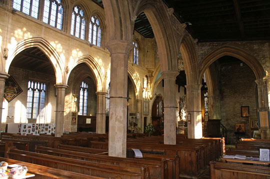 Nave and south aisle from the south door. Note the tall clerestory that gives this church so much light.