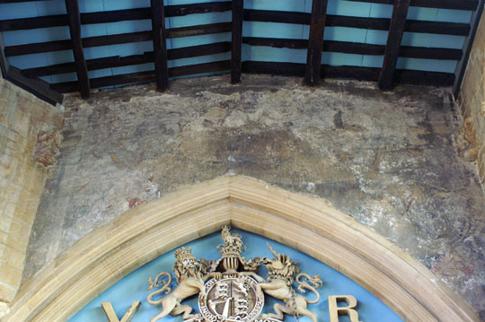 Finally, there are the remains of wall painting above the chancel arch and its somewhat overpowering arms of Queen Victoria.