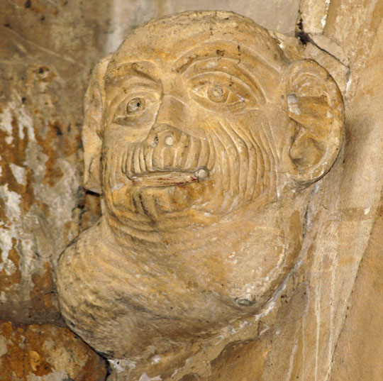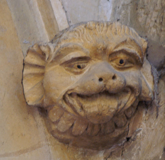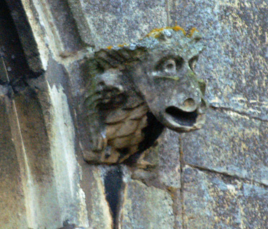 Besides the monuments, the main interest for us lay in the many carvings within the nave. Here there are grotesque animals running down between the arcades and some particularly gormless-looking faces. Simon Jenkins refers vaguely to the “seven deadly sins” but I struggled to identify them. Over the huge porch a couple of spooky figures stand guard, one clutching a bell. Best of all is the carvings is near the chancel arch - a man with a two headed dragon invading his eye and mouth. This is not easy to discern without binoculars ot telephoto lens.