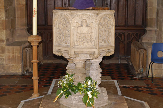 The font. “Harris’s Guide to Churches and Cathedrals” describes it thus: “The font is unique in being a pseudo-Gothic octagonal bowl resting on a Renaissance base with bulbous legs, again like an Elizabethan dining table”.