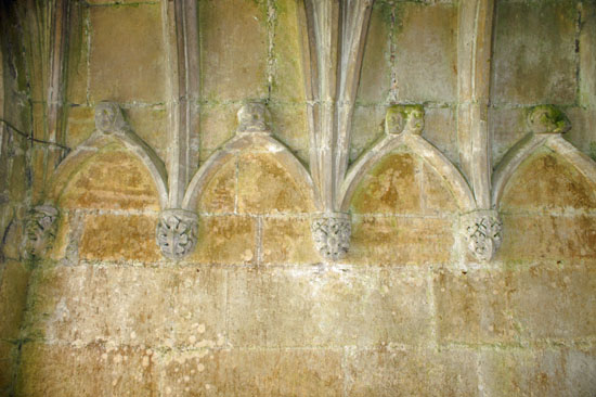 Left: The triple sedilia and a small piscina in the chancel. Again, who would know this is not perpendicular period? Right: Elaborate vaulting, arcading and carvings within one of the porches.