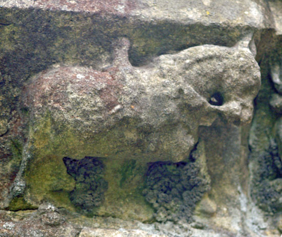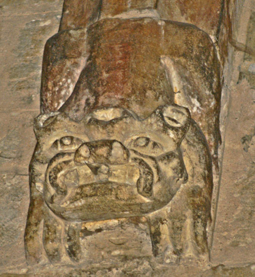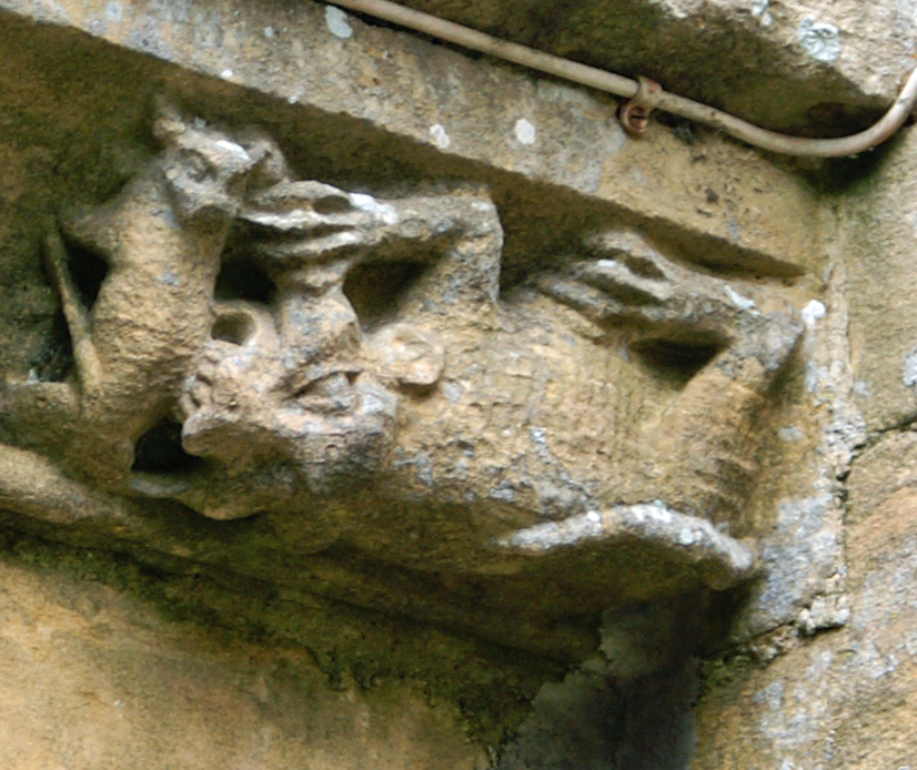 First off, at the top left we can see a “Mooning Man” carving. Like the friezes themselves, the mooning man is very much an East Midlands trademark . This one is a fat little chap that seems to be wearing a stripy pullover. Top centre is an odd creature that seems to have similarities with others at Oakham, Langham, Whissendine and Cottesmore in Rutland and at Buckminster and Hungarton in Leicestershire. I believe that they are representations of fleas which were a curse of mediaeval people but which were impossible to see properly in those microscope-less days. . As with all of the friezes there are some that are unique and many that are hard to interpret. One of the most interesting is top right where an upside down beast seems to be sinking his teeth into a smaller one. The second row shows the usual mix of beasties and exhibitionists. Bottom left is my favourite - a chained bear, sad as we might feel about his plight. Bottom Centre is a horse with harness. Bottom right is what looks like a Green Man with a a rather minimalistic pair of oaks leaves spewing from his mouth - except his ears are animalistic.