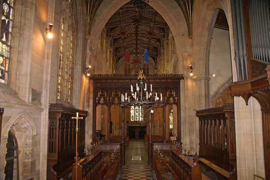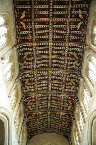 The earliest part of the church is the west windows of the aisles which are about 1290. Most of the rest is late Decorated or early Perpendicular - late c14. There are porches on both north and south sides probably from around the same period that are nearly identical and exceptionally fine. The clerestory is late perpendicular. The nave ceiling is a delight. It too was restored but retaining as much original timber as possible and using the original colours