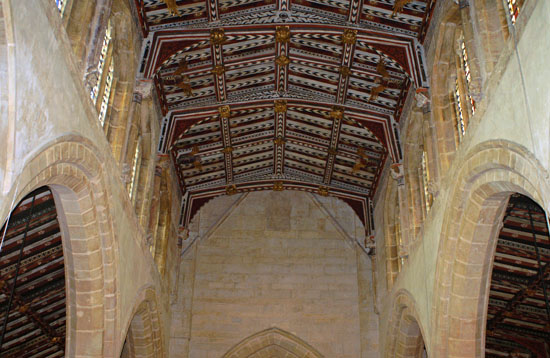 Left: The chancel ceiling. Right: The west end. Note the pretty Decorated aisle windows.