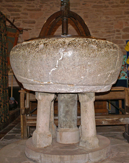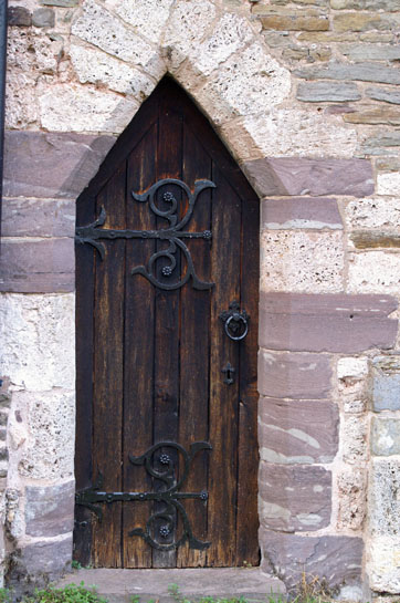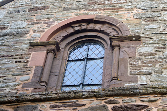 Left: The font is believed to be late c12, although if this was a church with Anglo-Saxon origins I see no reason why it shouldn’t also date from that period. It is composed of “breccia” which is a rock formed by the fusion of a variety of sedimentary rocks fused together by some sort of natural “cement”. Centre: The effigy of Sir Roger Vaughan in his plate armour. Right: The triangular headed Anglo-Saxon north doorway to the chancel. We need to be a little careful in invariably attributing such features uniquely to pre-Norman years: even the Normans had to used Saxon masons after the Conquest! Given the amount of Romanesque Norman work in this area, however, I think we can safely conclude that this doorway is of the Saxon period as well as of its style.