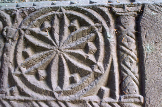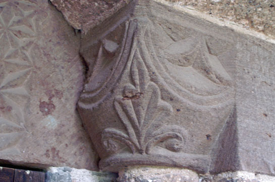 Left: One of the south door capitals. Right: A closer view of the roundel design on the north door lintel. In this picture you can see very clearly that the geometric motifs at the centre have been inscribed to produce a leaf pattern. There are crosses inscribed around the circumference of the inner ring. The little baluster to the right is also finely carved. This was no bodged job!