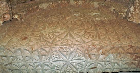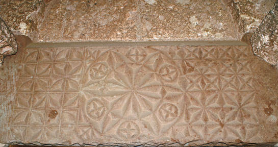Left: The even larger lintel over the south door. It does not resemble the north door lintel but both seem to owe something to the mason’s compasses .Again the tympanum has been partly obscured. Right: The lintel is also carved on its underside with a similar design.