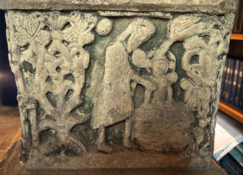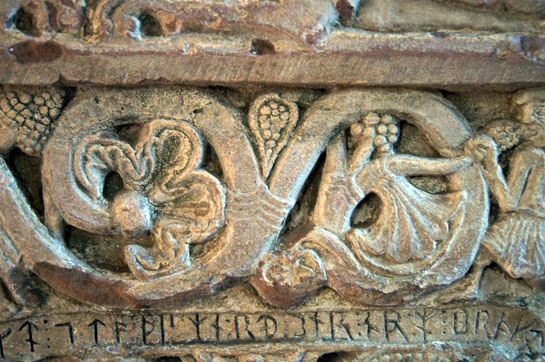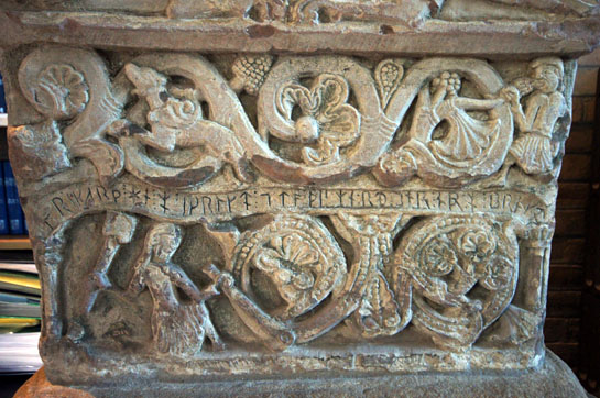 Left: The top panel. The church’s own guide to the font talks of “two affronted dragons” or alternatively “senmurvs” - dog headed griffins from Mesopotamian mythology. Right: Here we can see the runic script separating the central and lower panels. Runes tend towards vertical symbols thus allowing users to carve along the grain of wood or stone. The centre panel has a mass of grape vines.. On the left a wolf or dog appears to be leaping out. On the right a man eats a bunch of grapes. In the lower panel we see on the right an unusual image of a mason at work, presumably based upon Rikarth himself. Note the size of the mallet and chisel that he holds. It is eloquent testimony to the crudeness of the tools with which early masons created their miracles. Left and Right Below: Close ups of the lower bottom course and the runes