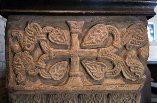 The east face is the one that excites historians because it has clearly legible writing in runic script and is perhaps the best surviving example in England. An approximate translation is “Rikarth (or Ricard) he made me and brought me to this splendour”. So we know of the man who made the font! Runes are a Germanic script form and so would have been known and used by the Angles, Jutes some and the other tribes that invaded Britain after AD430 - but not by the Saxons. The same is true of many of the Norsemen so it is hardly surprising that runes became the common script for communication amongst the non-scholars of England. This font is believed to date from around 1150, so this is a very late example emphasising Bridekirk’s “far flung” nature 90 years after the Conquest.