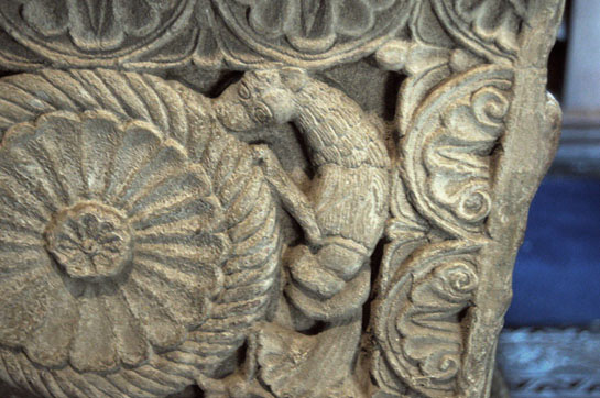 Left: A Greek cross bedecked with acanthus leaves. The church suggests that this derived from the Easter rite whereby a plain cross was taken into the church to be replaced by one with jewels and leaves to represent Christ risen. Right: The lower panel is quite classical. Two types of griffin flank a large floral roundel.
