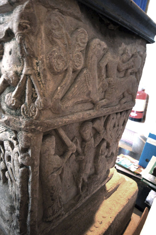 Apologies for the indifferent quality of these pictures. This side of the font is all but inaccessible and I had to a 12mm lens and long arms to get even these pictures. Left: The top panel. There is a magnificent centaur on the right, now sadly without a head! He is grappling with another beast in the left and seems to have hold of his foreleg. He is simultaneously under attack from an eagle on his right. Right: The lower panel has what is believed to be an image of Adam and Ever being expelled from Eden by an angry God wielding a sword. However, as the guide book rightly points out, Adam and Eve are not normally wearing clothes in this way.