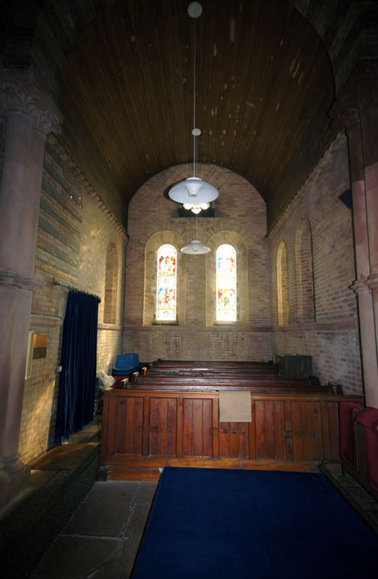 The builders, Cory & Ferguson, opted for a neo-Norman church built on a cruciform plan - that is, with a central tower and two transepts - and with an apsidal chancel. There are none of the decorative flights of fancy so beloved of the Norman builders: this church has an austere, almost Methodist, feel to it. The exterior is faced with stone but the interior is all of brick, giving a somewhat “industrial” feel to it. If you were to be dropped into it you might guess it to be located in Birmingham or Manchester rather than in rural Cumbria. Pevsner says pithily: “…all competently and dispassionately done”.