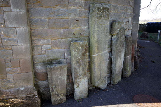 Left: Remains of the original church. Right: The new church has a number of ancient coffin lids, presumably found during the rebuilding.