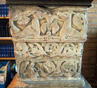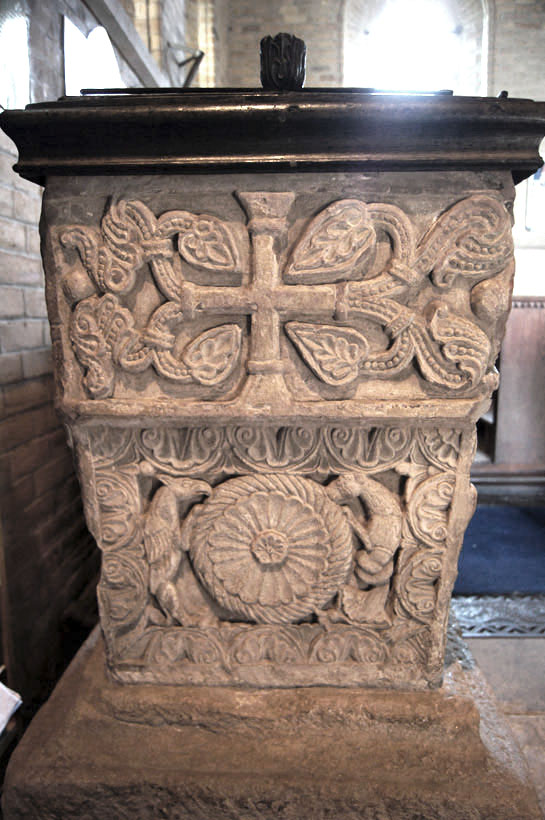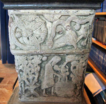 The east face is the one that excites historians because it has clearly legible writing in runic script and is perhaps the best surviving example in England. An approximate translation is “Rikarth (or Ricard) he made me and brought me to this splendour”. So we know of the man who made the font! Runes are a Germanic script form and so would have been known and used by the Angles, Jutes some and the other tribes that invaded Britain after AD430 - but not by the Saxons. The same is true of many of the Norsemen so it is hardly surprising that runes became the common script for communication amongst the non-scholars of England. This font is believed to date from around 1150, so this is a very late example emphasising Bridekirk’s “far flung” nature 90 years after the Conquest.