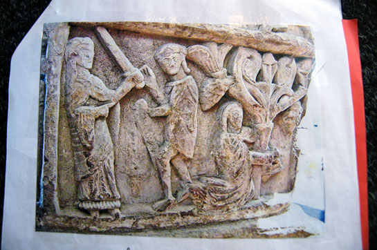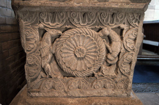 Apologies for the indifferent quality of these pictures. This side of the font is all but inaccessible and I had to a 12mm lens and long arms to get even these pictures. Left: The top panel. There is a magnificent centaur on the right, now sadly without a head! He is grappling with another beast in the left and seems to have hold of his foreleg. He is simultaneously under attack from an eagle on his right. Right: The lower panel has what is believed to be an image of Adam and Ever being expelled from Eden by an angry God wielding a sword. However, as the guide book rightly points out, Adam and Eve are not normally wearing clothes in this way.