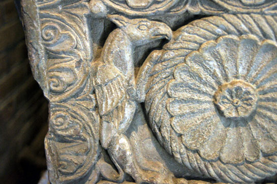 Left: A Greek cross bedecked with acanthus leaves. The church suggests that this derived from the Easter rite whereby a plain cross was taken into the church to be replaced by one with jewels and leaves to represent Christ risen. Right: The lower panel is quite classical. Two types of griffin flank a large floral roundel.