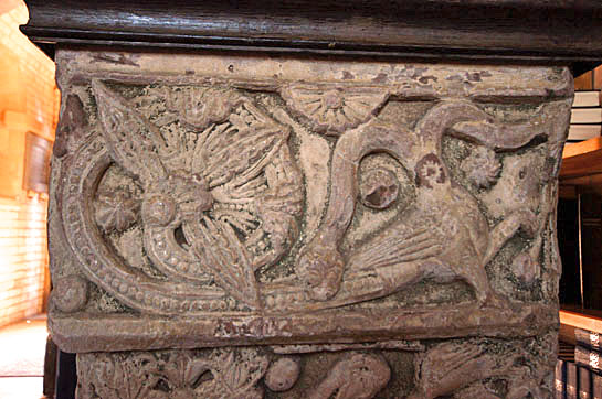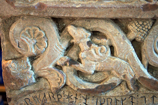 Left: The top panel. The church’s own guide to the font talks of “two affronted dragons” or alternatively “senmurvs” - dog headed griffins from Mesopotamian mythology. Right: Here we can see the runic script separating the central and lower panels. Runes tend towards vertical symbols thus allowing users to carve along the grain of wood or stone. The centre panel has a mass of grape vines.. On the left a wolf or dog appears to be leaping out. On the right a man eats a bunch of grapes. In the lower panel we see on the right an unusual image of a mason at work, presumably based upon Rikarth himself. Note the size of the mallet and chisel that he holds. It is eloquent testimony to the crudeness of the tools with which early masons created their miracles. Left and Right Below: Close ups of the lower bottom course and the runes