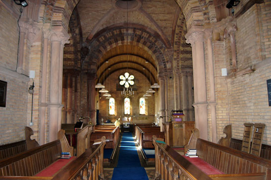 Top Left: Looking from the choir towards the west end. Top Right: The reredos is a beautiful course of blind arcading carved in what looks like red sandstone. The patterned infill is very effective. This is a neo-Norman church, not an original one, and the builders have, to my eyes, created something very striking and we should not underestimate the challenge of building it to an apsidal profile. Above Left: The choir and chancel. The rib faults are also finely executed although the builders have avoided putting Norman dogtooth or chevron patterns to the ribs. I guess it’s a matter of taste but to my eyes, again, there would be nothing to be gained in trying to pretend this was an original Norman building. Above Centre: Looking through the crossing to the west end. It is interesting that the builders used alternate colours of brick in building the arches. It gives them a rather Moorish look such as one sees at the mosque in Cordoba, Spain. Above Right: One of the transepts.