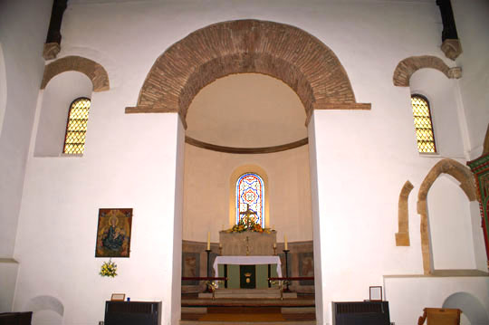 The view to the east end of the church. To left and right you can see the entrances to some of the original porticuses. You can see that the round arches are made from two courses of mortared stone tiles, a very idiosyncratic feature of this church. The arch in the foreground denotes the start of the original chancel that rose above nave and porticuses to form a low tower. Originally there was a triple archway; a tall central arch flanked by two lesser ones. Above these lesser ones were two more openings, The chancel arch we see now is fourteenth century but it springs from those original upper arches. At the east end we see an Anglo-Saxon arch to the apse with two flanking windows to the outside. The east window itself is not original.