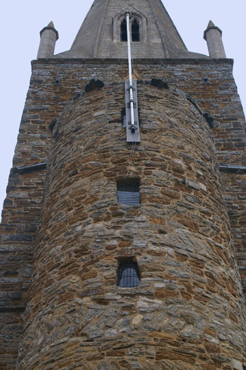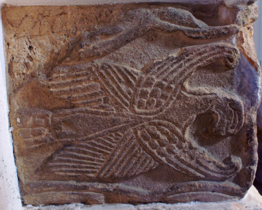 Left: This is the “Brixworth Eagle of St John”. Taken from a Saxon cross-shaft, it rests by the south door protected by a perspex sheet. Centre: The tower stair turret from the west. The limit of the original Saxon work in the base of the tower is clearly marked by the string course. Right: The stair turret is eleventh century, a little later than the tower itself. The herringbone visible here in courses right up to the flagpole indicate that it is Saxon rather than Norman.