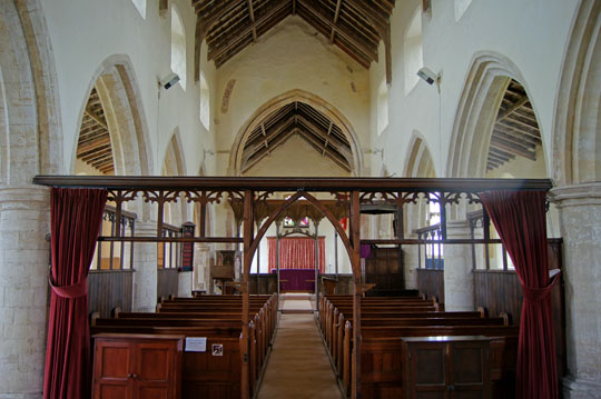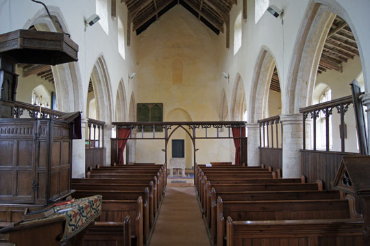 Burnham Norton has an unusual layout today: its aisles are empty and modern wooden screens have been placed within the arcades effectively enclosing the nave. This is carried through to the west end of the nave where a similar screen leaves a large empty space between the seating and the west wall. Imagine a kind of sanctum for the congregation surrounded by a wide U-shaped open space.