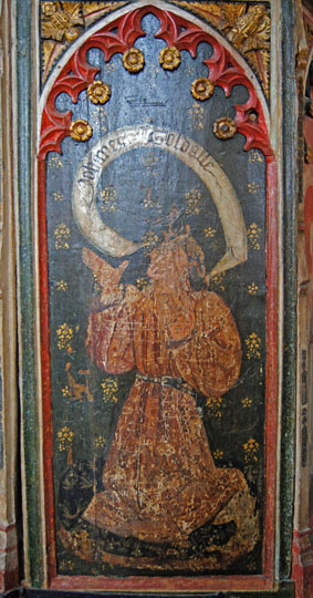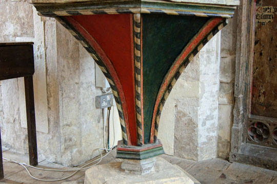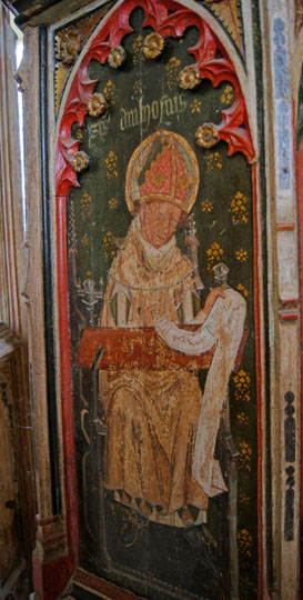 So far, so ordinary, albeit very pleasant. It is the woodwork, however, that sets this church alight. The rood screen has three original painted panels on each side. They have been terribly defaced but at least they have survived unlike most pre-Reformation screens. The real treasure here, however, is the “Wineglass Pulpit” which is thought to be the best in the country. It was donated in 1450 by one Johannis Goldale and his wife, Katherine. These donors are still immortalised on two the panels whilst the other four are filled by the “four doctors” of the Church: SS Ambrose, Gregory, Jerome and Augustine. “Doctors” of the Church are individuals whose writings have been regarded as of great value to the Church and these four were invested in 1298. These men were theologians of the old unreconstructed Roman Catholic Church. How on earth, I ask myself, did these images survive the Reformation? Whatever the reason, the Church Guide records that our old friends the Victorians painted over them and they were not restored until the 1970s. It is extraordinary to think that the panels survived the iconoclasts of the Reformation but not the po-faced rectitude of the Victorian era. Unless of course they were painted over during the Reformation as well. Who knows?