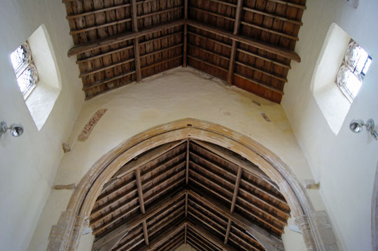 The lofty Perpendicular chancel arch shows the tell-tale signs of alterations: orphaned fragments of wall painting and masonry.
