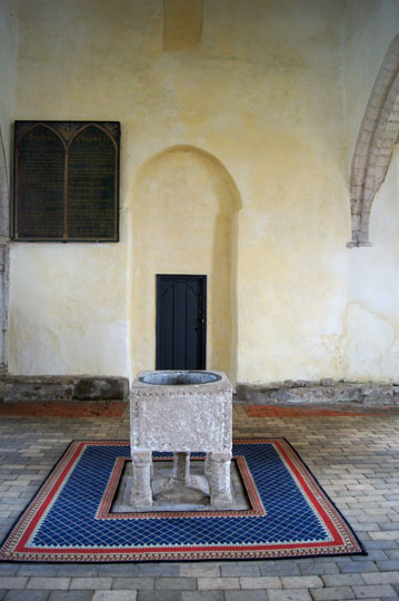 The font sits proudly at the west end - and what a superb touch on the part of the church people to highlight it with a carpet surround. Modernity and anitquity can be complementary. Beyond the font, what was presumably the original tower arch is now inset with a modern door.