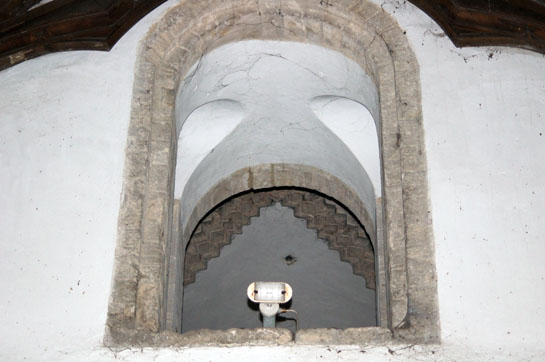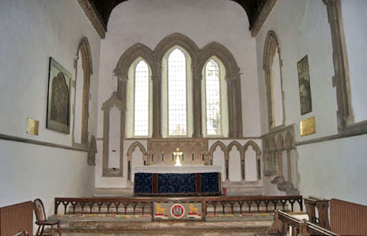 Left: The groined vault of the original Norman tower. Note the symmetrical windows at each cardinal point. Right: The single round-headed window space between chancel and tower.