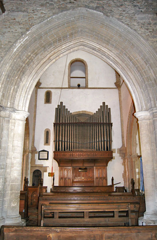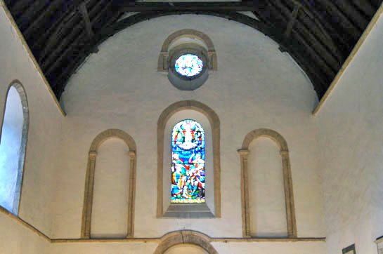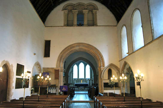Above: The west end interior showing the original group of three Norman windows. Although the round window is Victorian, it can be seen that was originally a small arched window here. Note the Victorian south nave windows to the left that have been made to be of the same dimensions.