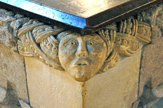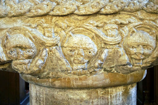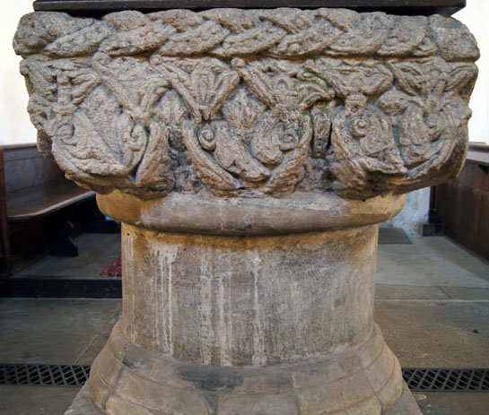 Left: Detail of the arches above the nave arch. Again, there is no compromise in quality. Right: The decorated capitals of the the nave arch have complex interlaced designs in the Scandinavian style.