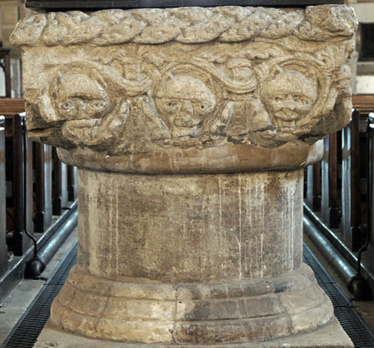 The Castle Rising font is a fine example. The “North Norfolk School” of Norman fonts is widely recognised and many would include Castle Rising within it. In my view, however, the font at Castle Rising (as well as that at South Wootton) should be seen as stylistically and philosophically separate from those at Sculthorpe, Toftrees and Shernborne which each have symbolic allusions to the Greek view of the Cosmos. For more about this click HERE and then follow the further link to the research of the late Mary Curtis Webb. There is nothing obviously “Christian” about the designs on this font - nor is there anything obviously Greek for that matter. Church historian Bob Trubshaw believes that the fairly common motif of four heads at the corners of Norman fonts can be explained as representing devils being driven out from the four rivers of Paradise through the rite of baptism. He admits, however, that many such figures are from being devil-like and these four at Castle Rising are certainly not so. What also are we to make of the three cats’ heads?
