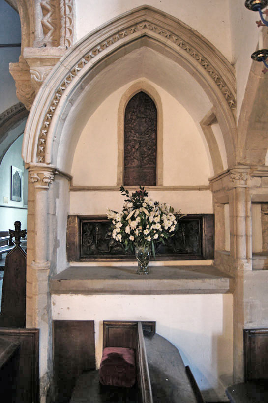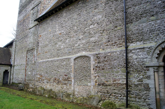 Left: To the north of the nave arch we can see both a an altar recess adjoining the arch itself and a blocked round-headed arch built into the north wall of the nave. It is not clear what this arch was for. It is surely too large to be a Norman doorway. Right: The north side presents an altogether less ordered look. There are no windows and two blocked doorways and, just visible to the right, a Norman doorway still in use. No picture better illustrates the enigmatic nature of this church. It seems to have experienced alternate periods of rich endowment, decay and restoration leaving many puzzles.