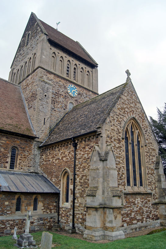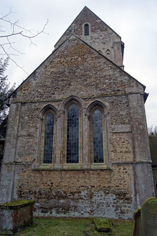 Left: The south transept and the tower. We can readily see the steeply-pitched roof line of the original structure and also a now partly-obscured round-headed window. The builders Victorian did not simply demolish one transept and replace it with another: the original one had been long-demolished and the large arch between tower and transept had been blocked. A drawing made in 1810 by John Sell Cotman reveals a church made ugly by aesthetically disastrous insertions of gothic windows and by blocked doorways. The drawing also suggests that the roof line of the nave now follows the original Norman line, having been made lower at some stage. The top section of the tower, including its “saddle-back” roof section are also Victorian additions and this raising of the tower would have been essential to preserve a sense of proportion to the church once the nave roof line had been raised. Right: The east end with its Early English triple lancet window.