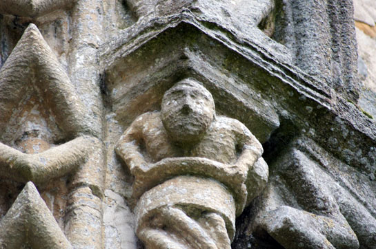 Left: There are few sights more impressive to the eyes of a lover of Norman architecture than Castle Rising’s west front. The upper courses of blind arcades and the small round windows are all Victorian additions. The large central window are adjoining blind arcades are original, as is the west doorway. Right: The west end window is a gorgeous piece with numerous courses of decoration including barley-sugar twists to left and right and some lovely carved figures.