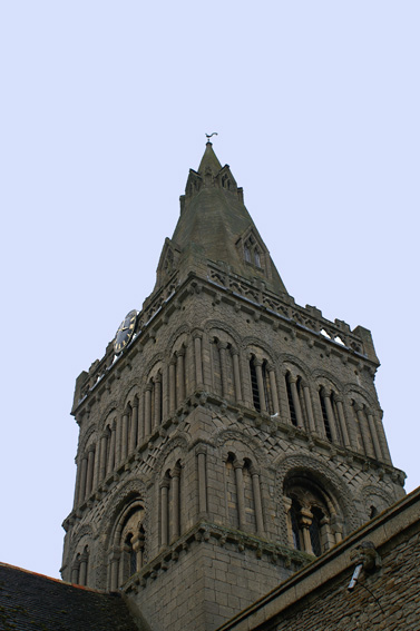 Top: The nave roof also has painted angels. Bottom: A close up of the stunning Norman tower. Right: The tower from the south east.