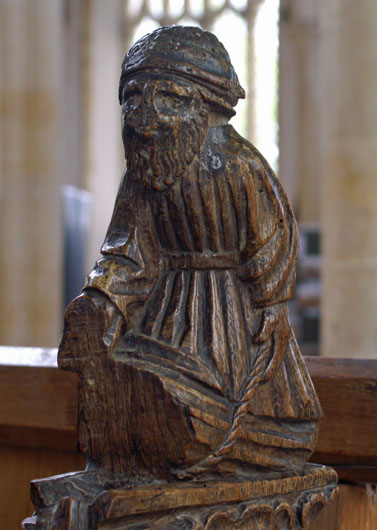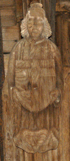 First and Second Left: Two mediaeval roof carvings from the chancel - one a lute player. Third and Fourth Left: Two much more recent carving s from the refurbished nave roof. Far Right: The church from the east end. From this angle the tower looks oversized compared with the church’s width. The east wind is huge and unstained.