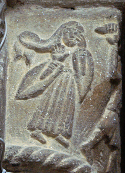Left: The most famous of Castor’s capitals. It is thought likely that the distressed figure on the left is Kyneburgha herself and the two figures to her right are fighting. The ugly character on the right is clearly the villain of the piece and is thought to have had designs on her maidenly honour. Right: A “Cat mask” device. To it’s right is a Green Man. To the left a very perky bird with a long beak.