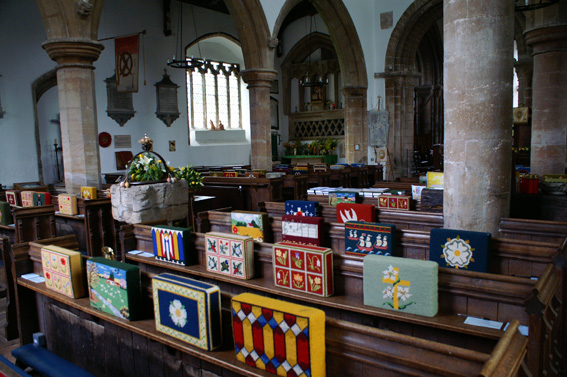 Left: These kneelers make for a lovely colourful picture of the church. The font is c12 and Norman in style. Needless to say, like almost all such fonts, it was declared surplus to requirements at some stage and on this occasion dumped in the churchyard! It was restored in 1928. Right: One of the church’s greatest treasures: an eighth century carving of St Mark. It was found under the altar rails when they were removed and is from the original shrine of St Kyneburgha.