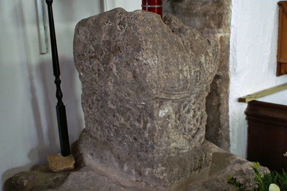 Left: These kneelers make for a lovely colourful picture of the church. The font is c12 and Norman in style. Needless to say, like almost all such fonts, it was declared surplus to requirements at some stage and on this occasion dumped in the churchyard! It was restored in 1928. Right: One of the church’s greatest treasures: an eighth century carving of St Mark. It was found under the altar rails when they were removed and is from the original shrine of St Kyneburgha.