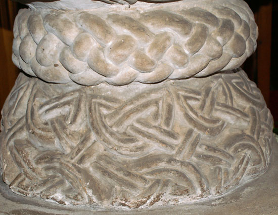 The Font is described in the text above. Note the lovely inter-lace work at the base and the cable moulding design at the base (above). To the right we can see that the font did require repair at some point in its long history. It is disappointing that the “new” stone is so conspicuous. Note also, however, that the inter-laced carving at the rim is “tighter” in the repaired section and in some indefinable way loses some of the exuberance of the design in doing so.