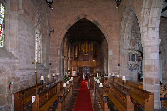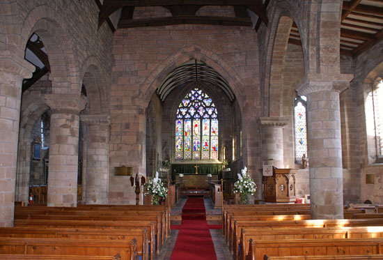 The view west from the chancel. To the right is the arcade to the north chapel. The chancel arch has been heavily restored.