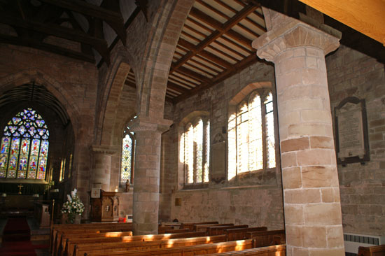 Looking eastwards. Note the similarity of the north and south aisles capitals, but that the south aisle bays are considerably wider and the arches are pointed.