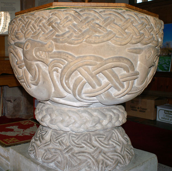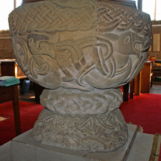 The Font is described in the text above. Note the lovely inter-lace work at the base and the cable moulding design at the base (above). To the right we can see that the font did require repair at some point in its long history. It is disappointing that the “new” stone is so conspicuous. Note also, however, that the inter-laced carving at the rim is “tighter” in the repaired section and in some indefinable way loses some of the exuberance of the design in doing so.