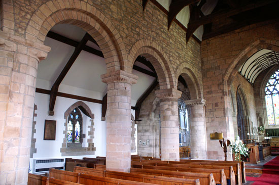 Looking eastwards. Note the similarity of the north and south aisles capitals, but that the south aisle bays are considerably wider and the arches are pointed.
