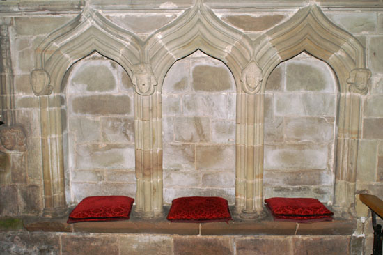 The tripartite Sedilia has ogee arch canopies like that of the piscina (above) but is much less decorative. Heads decorate the “piers”, however.