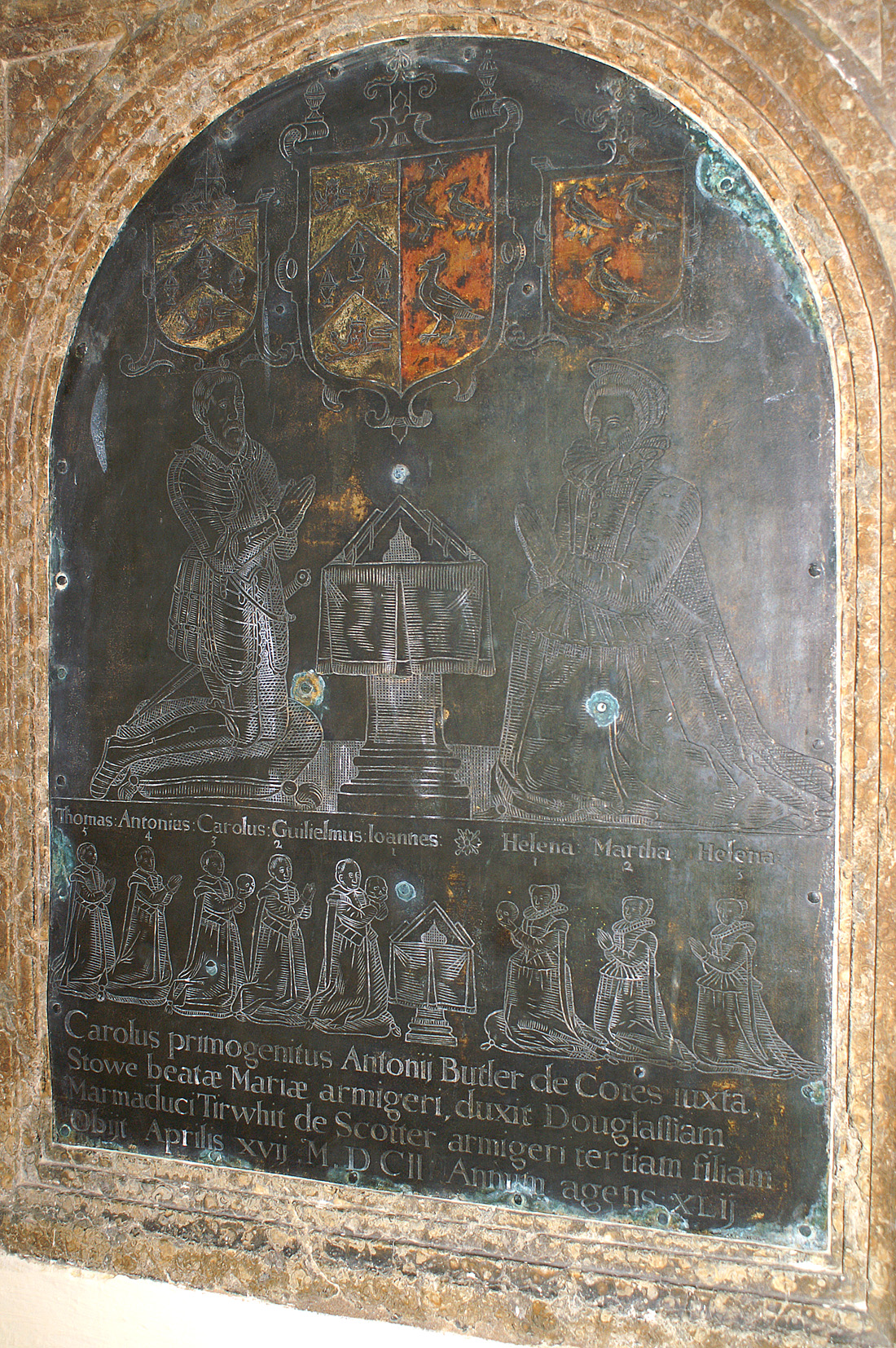 I loved this brass monument so much that I decided to reproduce it in a large size. My Latin is non-existent so I am grateful to Alan Durham who emailed me with this translation (and corrected my earlier misconceptions) : “Charles, first born son of Anthony Butler of Coates by Stow St Mary, squire, married Douglas, third daughter of Marmaduke Tirwhit of Scotter, squire”. The date is 1602. Scotter is fourteen miles north of Coites. There is wonderful detail here even on the images of the eight children. Three of them bear skulls so I surmise that they pre-deceased their parents. Note the wonderful colouring on the coats of arms.