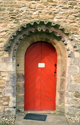 Left: The northern aspect with its rather bizarre of mixture of windows in four different architectural styles. Note the unused and bricked up archway in the west wall, as well as blocked north doorway. Right: The south side with its Transitional period doorway, its door painted a very fetching red! There are a couple of Tudor style windows and a blocked priest’s door. There are no signs of blocked windows so I surmise that the later ones obliterated the earlier ones.