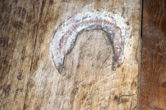 Left: The rood loft with a king post helping to support the trusses. Note the oval mark left of centre. Right: This close-up reveals that the oval mark is actually raised above the surface of the wood and painted. A halo perhaps?